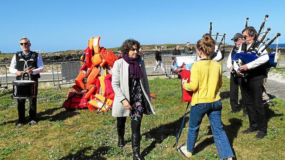 Le public était invité à déposer un gilet de sauvetage sur une pyramide qui symbolisait le drame des naufrages des migrants, ce dimanche 21 avril 2024, lors du Printemps des solidarités, à Porspoder.