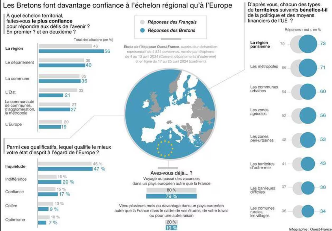 Trompeur, « Ouest-France » titre « Les Bretons font davantage confiance à l’échelon régional la Bretagne qu’à l’Europe » quand le résultat indique les Bretons font davantage confiance à la Bretagne (« la région ») qu’à l’Etat français.