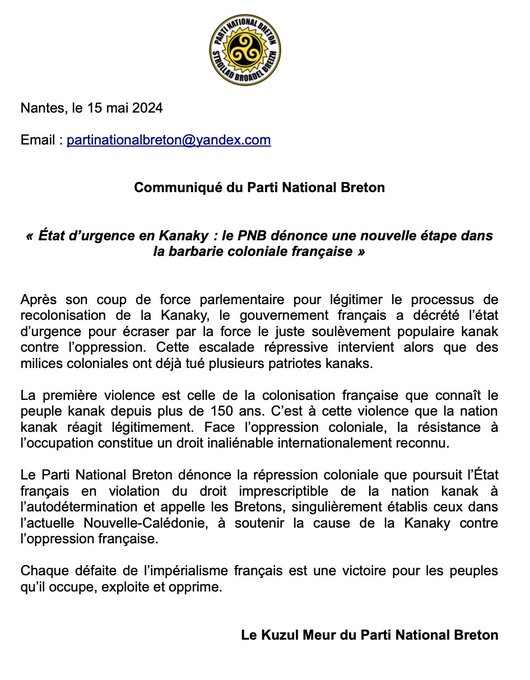 Suite à la proclamation de l’état d’urgence en Kanaky par le gouvernement français, le Parti National Breton dénonce la répression coloniale en cours.