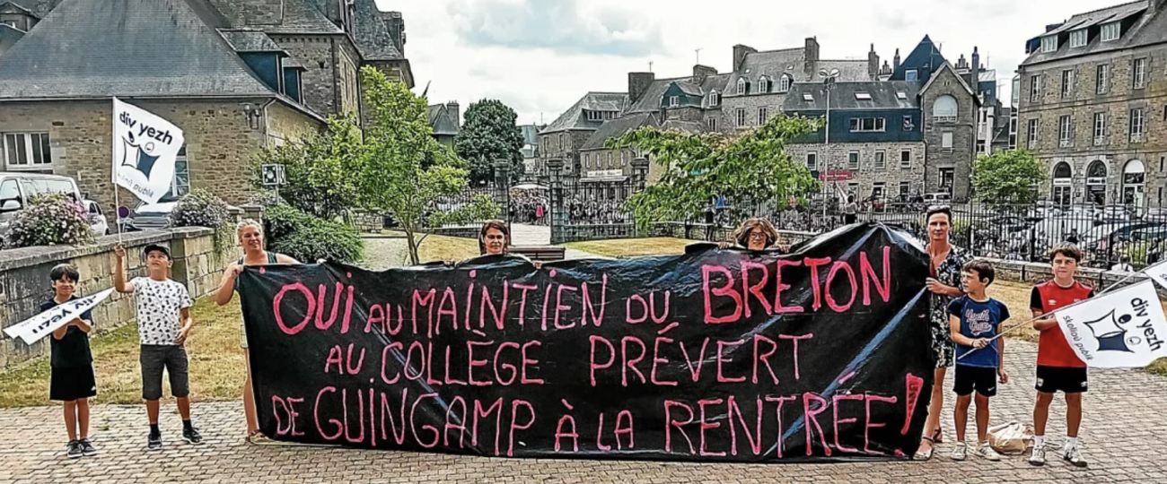 En plein festival de la Saint-Loup, parents et élèves du collège Jacques-Prévert ont manifesté, dimanche, devant la mairie de Guingamp avec une banderole revendicative : « Oui au maintien du breton au collège Jacques-Prévert de Guingamp. »