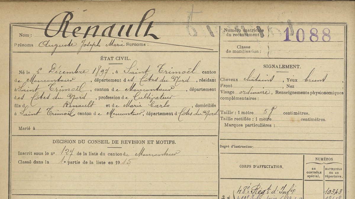 Il s’appelait Auguste Renault, né le 6 décembre 1897, à Saint-Trimoël, près de Lamballe. Soldat de première classe au 411e régiment d’infanterie, il meurt les armes à la main dans les Ardennes belges, seulement deux minutes avant le cessez-le-feu le 11 novembre 1918 à 10h58. C’est le dernier mort de la Première Guerre Mondiale.