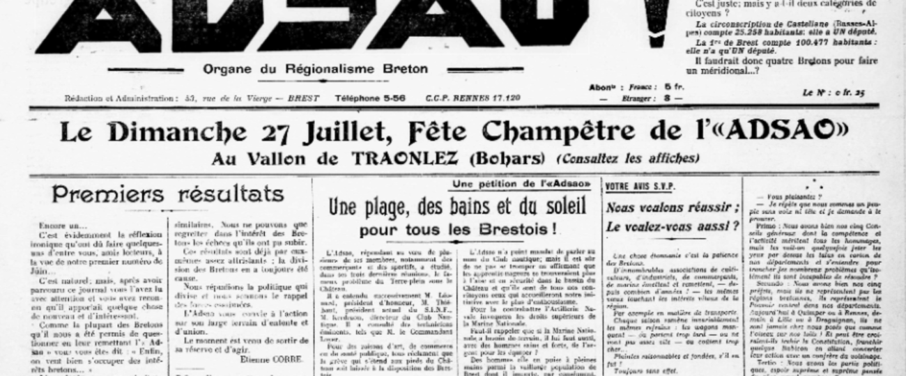 Il crée alors le mouvement Adsao en novembre 1929 avec une demi-douzaine de personnes réunies à Brest. Le numéro 1 de la revue mensuelle du même nom paraît le 1er juin 1930 et annonce que le but d’Adsao est de « libérer des entraves arbitraires les forces actives de la région et à restituer aux représentants de la province les moyens légaux d’assurer la vitalité de la race, l’essor de sa culture intellectuelle et morale, la prospérité de ses intérêts commerciaux, industriels, agricoles et maritimes. »