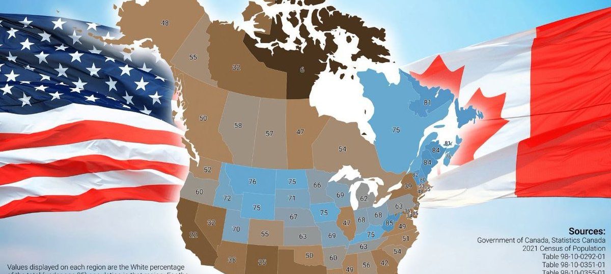 Selon cette analyse, seule 48,3 % de la population de moins de 35 ans dans ces deux pays est classée comme blanche (non hispanique aux États-Unis), avec des disparités régionales marquées : 59,6 % au Canada et 47,2 % aux États-Unis. Ces chiffres, basés sur des données officielles de Statistique Canada et du Bureau du recensement américain, soulignent une diversification croissante, particulièrement dans les régions urbaines et du sud des États-Unis, où les pourcentages chutent parfois à 22 % (Californie) ou 25 % (Nouveau-Mexique).