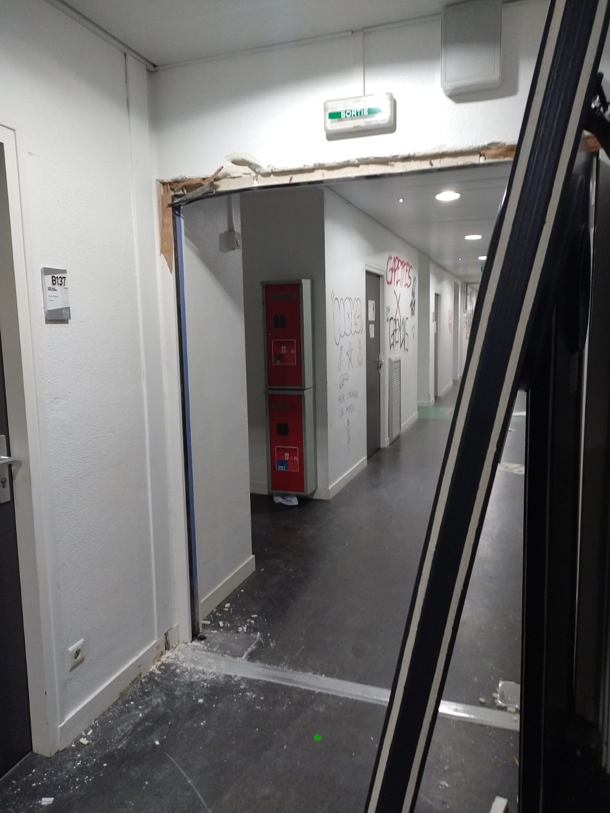 Selon nos informations, le bâtiment B a particulièrement souffert : systèmes de sécurité, alarmes, portes coupe-feu rendus inutilisables, ainsi que des murs et portes endommagés. Des tentatives d’intrusion auraient également visé les bâtiments L et Erève. Pour illustrer l’ampleur des destructions, nous partageons des photos, sans ajouter de commentaire.
