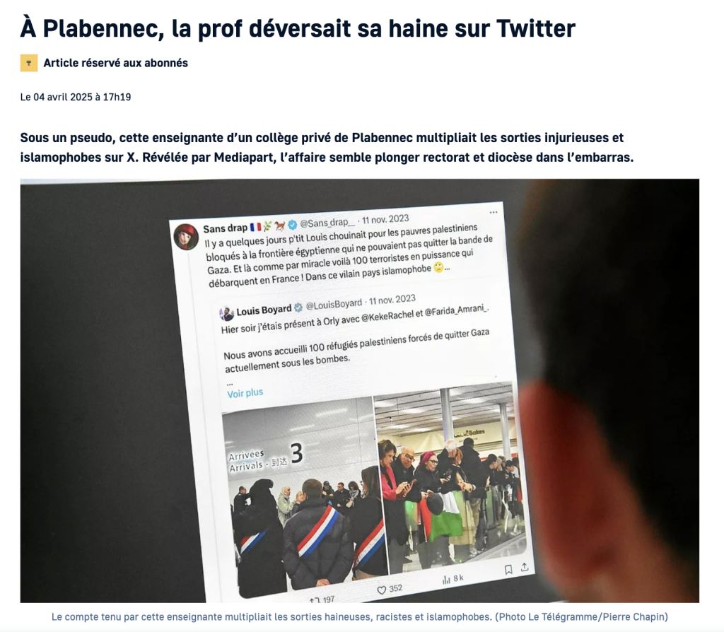 Une professeure d’un collège privé catholique du Finistère tient un compte influent sur X où elle diffuse des messages islamophobes. Au courant de son existence, la direction de l’établissement sous contrat n’a pas réagi avant les questions de @Mediapart. https://t.co/0Y4uNrDyHt