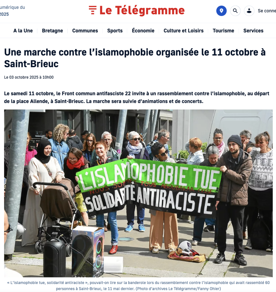 En Bretagne, l’extrême-gauche hexagonale, suivant en cela l’évolution du mouvement mélenchoniste, poursuit son inexorable transformation en relais de la propagande islamiste. C’est ce que traduit un rassemblement marginal contre « l’islamophobie » prévu le 11 octobre à Sant-Brieg (Saint-Brieuc) à l’initiative de divers groupuscules anarcho-marxistes.
