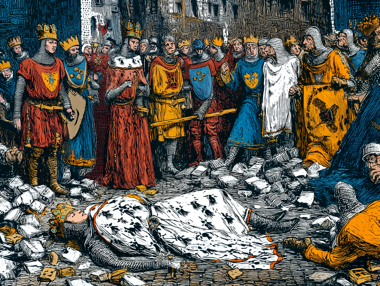 Hemañ a sevene ar garg-se pa zibunas an ambrougadeg dindan murioù kêr, un engroez stank a dud war o lein. Dres d’ar c’houlz m’edo ar Pab o tremen, an dug Yann krog e rañjenn e jav, e disac’has trumm ur pennad-moger bras gant pouez an arresterien, hag e kouezhas en un taol. Stlapet e voe ar Pab d’an douar diwar gein e varc’h. Un dousennad tud uhelañ, en o zouez kont Valois, a voe gwall c’houliet. A-zindan ur meneziad mein hag atredoù e voe tennet gant bec’h dug Breizh, hanter flastret e gorf.