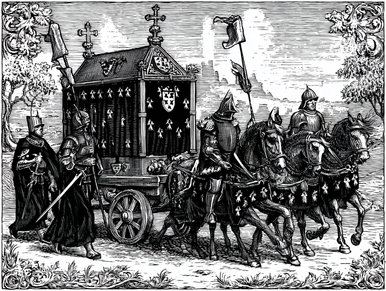 Goude an ofis e lakajod an arched war ur c’harr pallennet-du, stlejet gant pevar roñse. Er penn-araok e teue daou skoedour harnezet penn-da-benn, war gein daou varc’h-kad, o tougen ardamezioù Breizh ha skoedoù ar priñs marv, livet-splann.