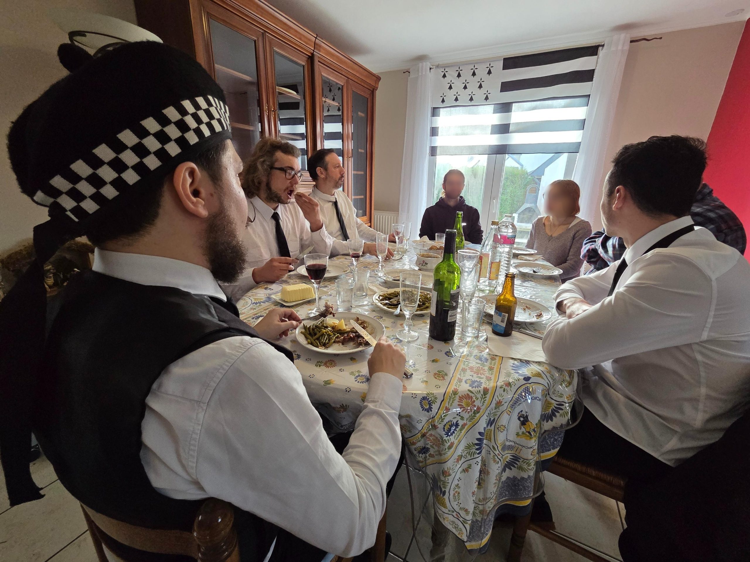 Ce samedi 10 janvier 2026, une quinzaine de militants et sympathisants des sections du Léon et de Cornouaille du Parti National Breton se sont retrouvés pour un repas partagé suivi d’un moment symbolique fort : l’installation et la levée d’un mât Gwenn-ha-Du. Dès 12h30, la tablée s’est installée autour d’un agneau de 7 heures fondant, accompagné d’une sauce à l’oignon et de légumes bien mijotés. Le plat, préparé avec soin, a fait l’unanimité : quasiment tous les convives ont tenu à dire à quel point c’était excellent. Treize personnes étaient présentes, parmi lesquelles le vice-président du parti, les responsables et plusieurs militants des sections du Léon et de Cornouaille (six membres du PNB au total), ainsi que trois femmes dont une jeune adhérente d’une trentaine d’années.