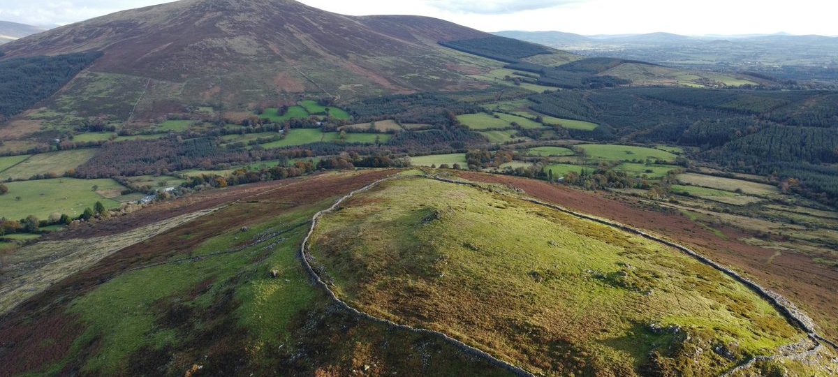 Situé dans le comté de Wicklow, Brusselstown Ring fait partie d’un ensemble plus large connu sous le nom de cluster de hillforts de Baltinglass, qui compte jusqu’à 13 grandes enceintes sur les collines environnantes. Ce qui rend ce site unique, c’est son étendue : il s’étend sur plusieurs collines, une configuration rare en Irlande et en Grande-Bretagne, et même peu courante dans l’Europe de l’Âge du Fer ultérieur. L’enceinte extérieure englobe notamment le site néolithique de Spinas Hill 1, indiquant une occupation quasi continue depuis le Néolithique ancien jusqu’à l’Âge du Bronze.