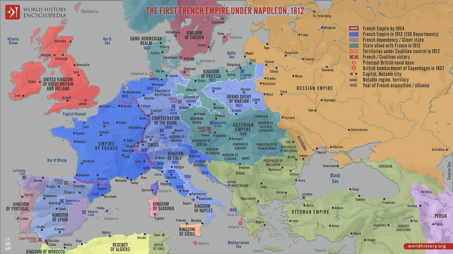 La Révolution française (1789-1799) et l’Empire napoléonien (1804-1815) portent l’expansion à un niveau continental. Les armées révolutionnaires annexent la Belgique, la Rhénanie et la Savoie dès 1792-1795. Napoléon, après son coup d’État de 1799, conquiert l’Italie, dissout le Saint-Empire en 1806 et crée la Confédération du Rhin, simple coalition fantoche de la France. À son apogée en 1812, l’Empire français contrôle 130 départements, incluant les Pays-Bas, l’Allemagne occidentale, l’Italie du Nord et les Provinces Illyriennes. Des royaumes satellites, comme l’Espagne sous Joseph Bonaparte en 1808, étendent l’influence française. Ces conquêtes imposent le Code Napoléon et des réformes administratives, mais suscitent des résistances nationales. La victoire des Européens à Waterloo en 1815 et le Congrès de Vienne restaurent les frontières françaises de 1792, marquant un recul majeur.
